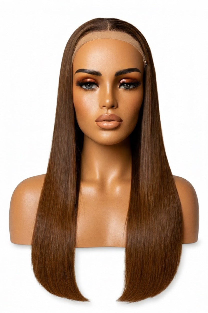 Virgin bone straight wig with a 5x5 HD closure, pre-plucked hairline, and adjustable band for a natural, customizable look.