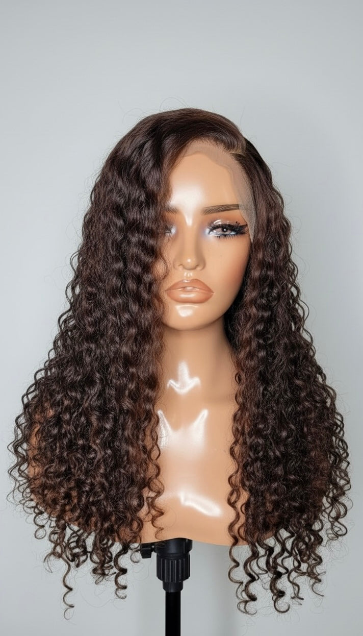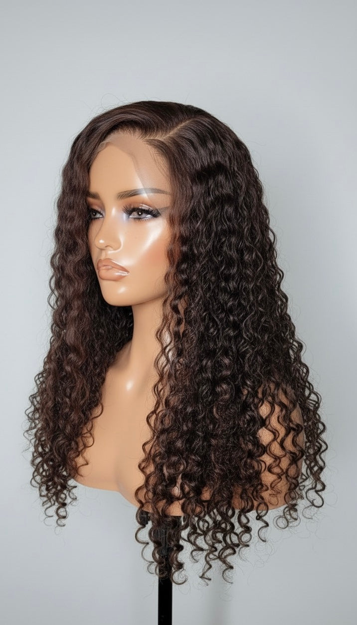 Virgin curly wig with a 5x5 HD closure, pre-plucked hairline, and adjustable band for a natural, customizable look.